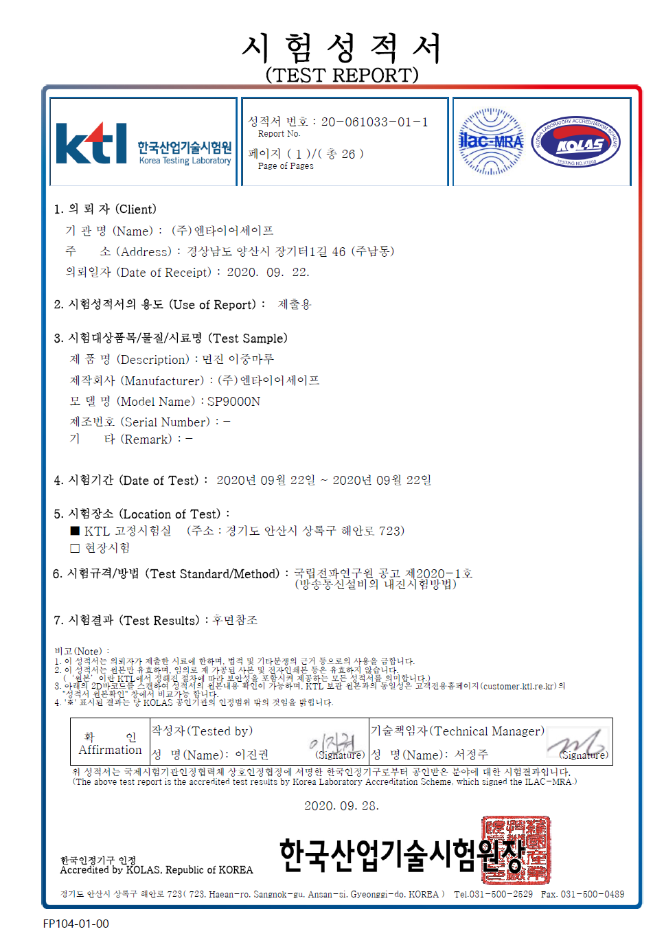 공인시험기관 성적서는 계속 업데이트 됩니다. 본 게시물 이후 시험성적서는 요청에 따라 제공됩니다.