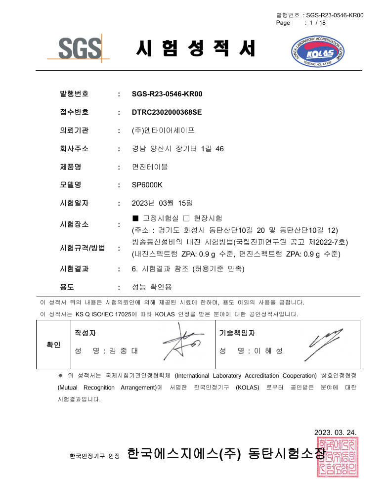 면진테이블 SP6000K 시험성적서 Admin 0 1 2시간전 면진테이블 SP6000K 시험성적서 전파연구원 공고 제2022-07 호에 따른 인공지진파를 가진하여 테스트를 통과한 시험성적서입니다. *. 성적서 원본은 전화 또는 게시판에 요청하시면 보내드립니다. 공인시험기관 성적서는 계속 업데이트 됩니다. 본 게시물 이후 시험성적서는 요청에 따라 제공됩니다.