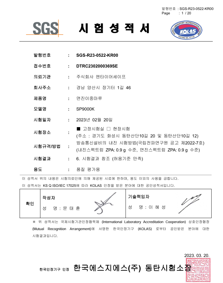 전파연구원 공고 제2022-07 호에 따른 인공지진파를 가진하여 테스트를 통과한 시험성적서입니다.